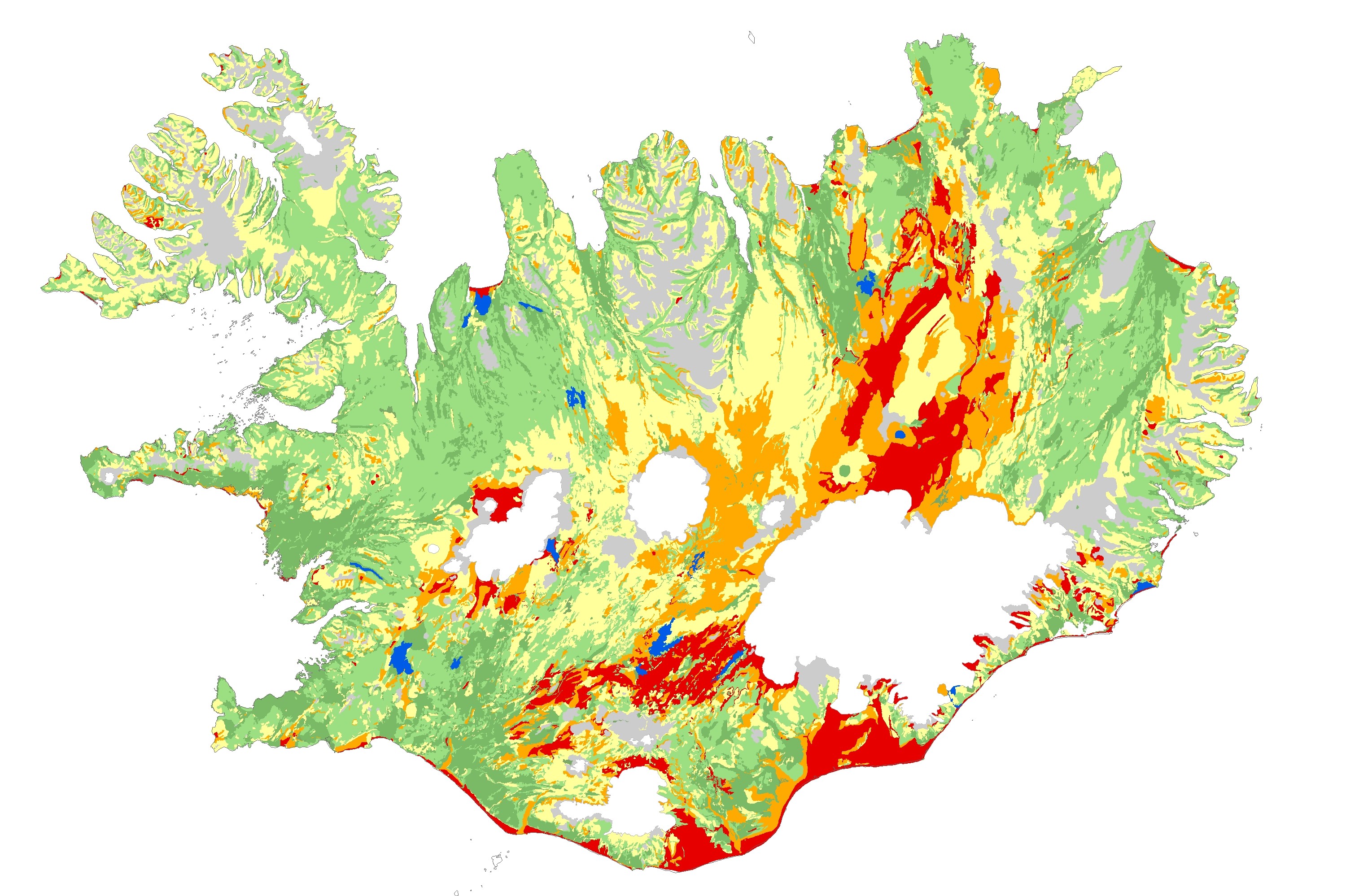 Description: <DIV STYLE="text-align:Left;"><DIV><DIV><P STYLE="margin:0 0 0 0;"><SPAN>Heildarúttekt á jarðvegsrofi á öllu Íslandi, unnin á árunum 1992-1997. Unnið með vettvangsúttekt þar sem LANDSAT gervitunglamyndir í mælikvarða 1:100.000 voru notaðar sem grunnur við kortlagninguna. Í rofkortlagningunni er annars vegar metið um hvers konar rof er að ræða (rofflokkar) og hins vegar hversu mikið það er (rofkvarði). Rofkvarðinn er frá 0 og upp í 5 þar sem 0 þýðir ekkert rof en 5 stendur fyrir mjög mikið rof. Rofflokkunum má skipta í tvo hluta, annars vegar þeir sem tengjast gróðurlendum þ.e.; áfoksgeirar (A), rofabörð (B), dílarof (D), jarðsil (J), skriður (K) og vatnsrof (V), og hins vegar rofflokkar á auðnum sem eru; melar (M), sandar (S), sandmelar (SM), sandhraun (SH), hraun (H), moldir (O) og grjótskriður (C). </SPAN></P><P><SPAN>Nánari upplýsingar um einstakar rofgerðir má finna í bókinni </SPAN><SPAN STYLE="font-style:italic;"><SPAN>Jarðvegsrof á Íslandi</SPAN></SPAN><SPAN><SPAN>. </SPAN></SPAN><SPAN>(Ólafur Arnalds, Elín Fjóla Þórarinsdóttir, Sigmar Metúsalemsson, Ásgeir Jónsson, Einar Grétarsson & Arnór Árnason, 1997. Landgræðsla ríkisins og Rannsóknastofnun Landbúnaðarins).</SPAN><SPAN>Sjá </SPAN><A href="http://land.is/wp-content/uploads/2015/11/Jardvegsrof_islenska.pdf"><SPAN>http://land.is/wp-content/uploads/2015/11/Jardvegsrof_islenska.pdf</SPAN></A><SPAN>In English </SPAN><A href="http://land.is/wp-content/uploads/2015/11/Jardvegsrof_enska_Soil_Erosion.pdf"><SPAN>http://land.is/wp-content/uploads/2015/11/Jardvegsrof_enska_Soil_Erosion.pdf</SPAN></A></P><P><SPAN>Skráð skv. fitjuskrá </SPAN><SPAN STYLE="font-style:italic;">Jarðvegsrof_1utg_04122018</SPAN><SPAN>.</SPAN></P><P><SPAN /></P><P /></DIV></DIV></DIV>